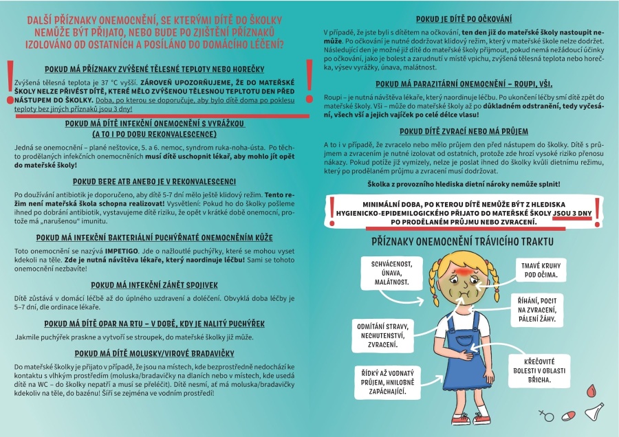 Dítě musí být minimálně 3 dny bez teploty, bez dalších příznaků onemocnění. - Dítě nelze přijmout do MŠ den po zvracení nebo průjmu.