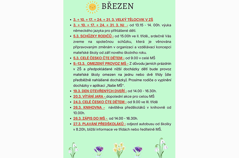 • 9.-13.3. OMEZENÝ PROVOZ MŠ - Z důvodu jarních prázdnin v ZŠ a předpokládané nižší docházky dětí bude provoz mateřské školy omezen na jednu nebo dvě třídy (dle předběžně nahlášené docházky). Prosíme rodiče o vyplnění docházky v aplikaci „Naše MŠ".