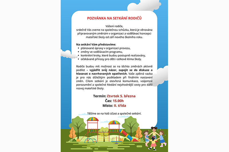 srdečně Vás zveme na společnou schůzku, která je věnována připravovaným změnám v organizaci a vzdělávací koncepci mateřské školy od září nového školního roku.