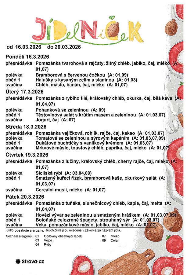 Aktuální jídelní lístek od 16. 3. 2026 do 20. 3. 2026