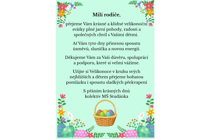 přejeme Vám krásné a klidné velikonoční svátky plné jarní pohody, radosti a společných chvil s Vašimi dětmi.