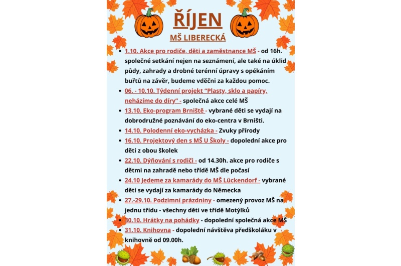 • 13.10. Eko-program Brniště - vybrané děti se vydají na dobrodružné poznávání do eko-centra v Brništi.