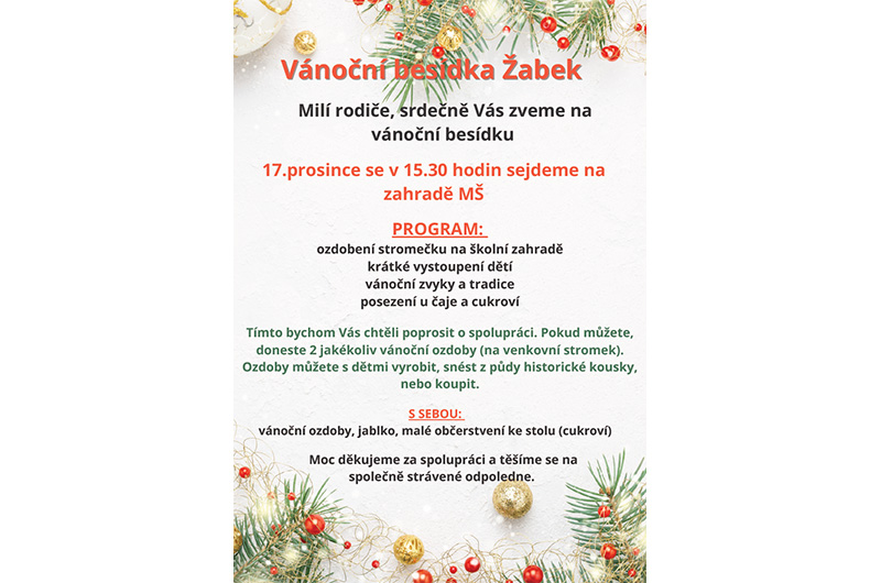 PROGRAM: ozdobení stromečku na školní zahradě, krátké vystoupení dětí, vánoční zvyky a tradice, posezení u čaje a cukroví