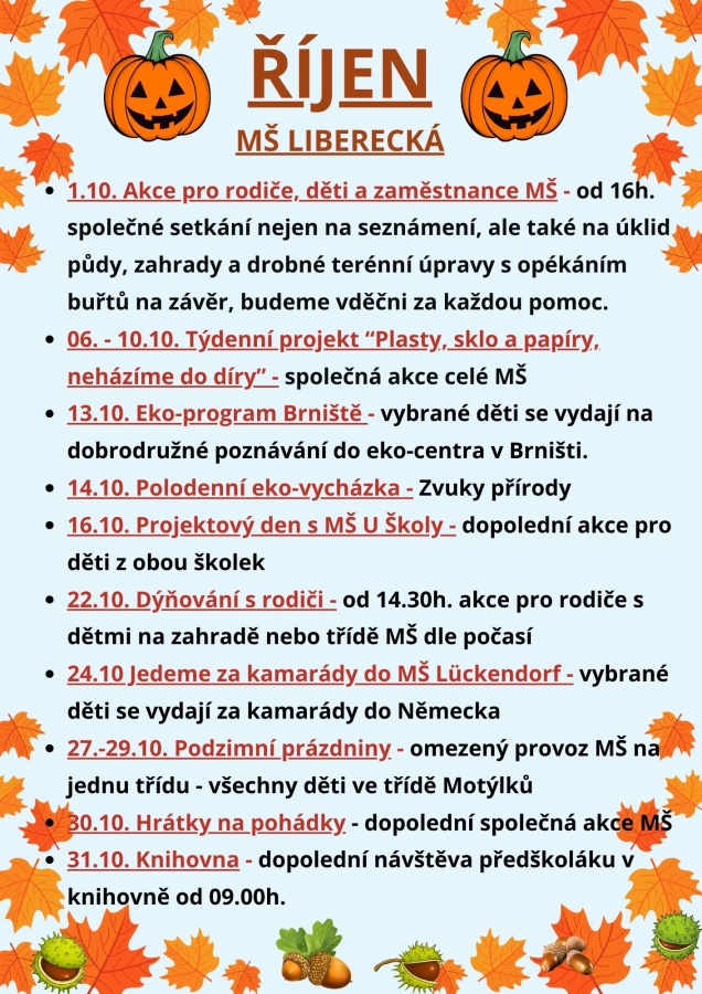 • 22.10. Dýňování s rodiči - od 14.30 h. akce pro rodiče s dětmi na zahradě nebo třídě MŠ dle počasí