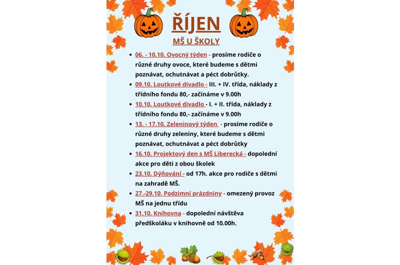 • 27.-29.10. Podzimní prázdniny- omezený provoz MŠ na jednu třídu
