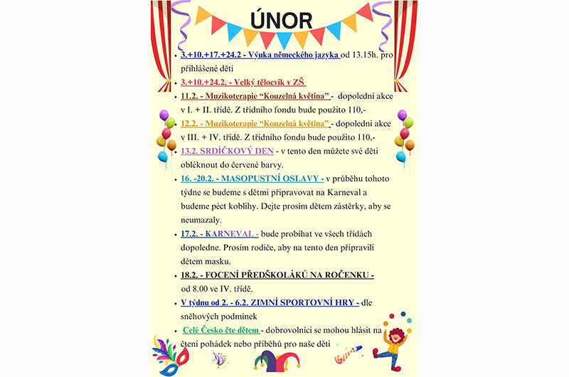 • 17.2. - KARNEVAL - bude probíhat ve všech třídách dopoledne. Prosím rodiče, aby na tento den připravili dětem masku