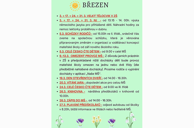 • 9.-13.3. OMEZENÝ PROVOZ MŠ - Z důvodu jarních prázdnin v ZŠ a předpokládané nižší docházky dětí bude provoz mateřské školy omezen na jednu nebo dvě třídy (dle předběžně nahlášené docházky). Prosíme rodiče o vyplnění docházky v aplikaci „Naše MŠ".