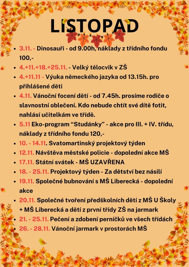 • 4.11. Vánoční focení dětí - od 7.45, prosíme rodiče o slavnostní oblečení. Kdo nebude chtít své dítě fotit, nahlásí učitelkám ve třídě.