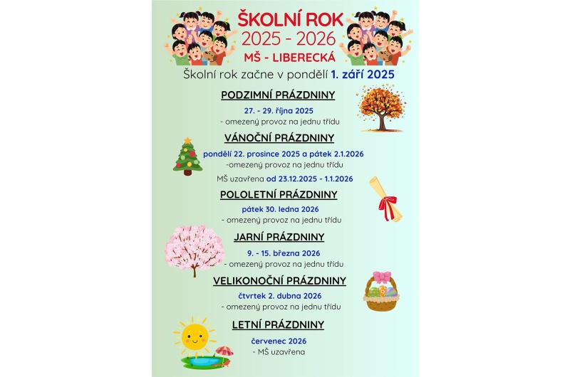• 27.-29.10. Podzimní prázdniny - omezený provoz MŠ na jednu třídu - všechny děti ve třídě Motýlků